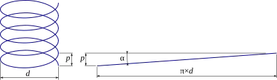En développant la vis (en la « déroulant »), le filetage de la vis est équivalent à un plan incliné. Si l'on considère une hélice d'axe vertical de diamètre d et de pas p, l'angle que fait la tangente avec l'horizontale vaut :