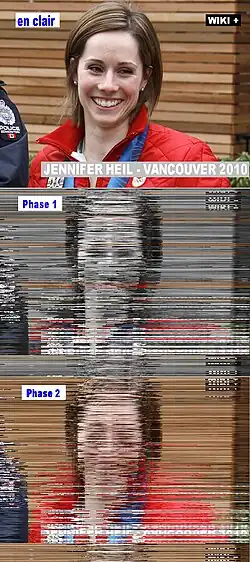 En France, le standard analogique sécam envoie alternativement les porteuses rouges et bleues. La chrominance est donc en demi-résolution la porteuse rouge est mise en mémoire et sera utilisée avec la porteuse bleue suivante et ainsi de suite. La table de permutation de la phase 1 ne respecte pas cette alternance : l'image est codée en noir et blanc et l'analyse des porteuses transmises de l'image codée permettent de déterminer la clef de 15 bit utilisée pour coder l'image.