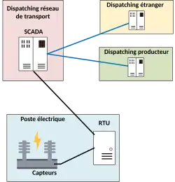 L'acquisition de données se fait à l'aide de contacts, de transformateurs de mesure ou de transducteurs au plus près des installations électriques. De façon symétrique, les ordres sont transmis à l'aide de relais tout-ou-rien ou de boucles de courant. Ces informations sont captées par une unité terminale distante (ou RTU pour remote transmission unit en anglais) et numérisées. Elles sont alors envoyées via un réseau de transmission aux niveaux supérieurs, typiquement des systèmes de contrôle et d'acquisition de données (SCADA) des dispatchings régionaux et nationaux où sont menées les opérations de conduite du réseau électrique. Suivant la structure du réseau, il peut y avoir de nombreux niveaux de conduite (deux en France, mais jusqu'à sept en Inde (en)).