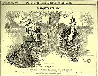 Légende: Scene à Hyde Park; ces deux personnes ne sont pas en train de communiquer l'une avec l'autre. La dame reçoit un message d'un admirateur, tandis que le monsieur reçoit les résultats des courses.