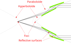 La première optique utilisant des miroirs en incidence rasante est réalisée en 1948, mais celle-ci présente une faible résolution angulaire. Hans Wolter met au point en 1952[2] trois types d'optiques, dites optiques Wolter de type I, II et III, qui combinent deux miroirs confocaux présentant une symétrie de révolution (paraboloïde, hyperboloïde ou ellipsoïde) : le rayonnement émis d'une source à l'infini est réfléchi successivement par les deux miroirs pour former une image au foyer commun des deux miroirs.