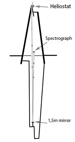L'observatoire se compose d'une tour de 41 mètres de haut, au sommet de laquelle se trouve l'héliostat. De là, la lumière est acheminée sur près de 60 m sous le niveau du sol qui, une fois arrivée au miroir principal, se voit réfléchie vers l'une des six ouvertures au niveau du sol. Pour éviter les distorsions lumineuses causées par l'air, l'ensemble optique est placé sous vide et, avec les instruments, sont installés sur une plate-forme rotative pesant 350 tonnes, en flottaison sur plus de 560 litres de mercure[2].