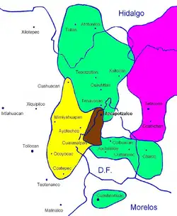 En rose : extension maximale, après l'assujettissement des Acolhuas (1418).