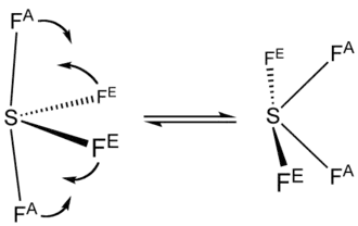Ces deux types de liaisons ne sont pas visibles dans le spectre obtenu par résonance magnétique nucléaire au fluor-19 de la molécule SF4, qui ne montre qu'un seul signal : ceci proviendrait des pseudorotations de Berry, au cours desquelles les atomes axiaux et équatoriaux échangent leur position à une fréquence supérieure à la résolution temporelle de la RMN, qui est de l'ordre de la milliseconde[7].