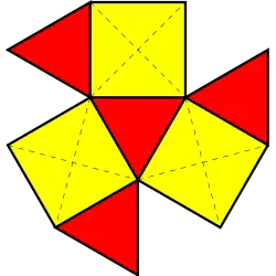 Il a 6 sommets, 12 arêtes, et 7 faces : 4 triangulaires (qui font partie de celles de l'octaèdre régulier) et 3 carrées.