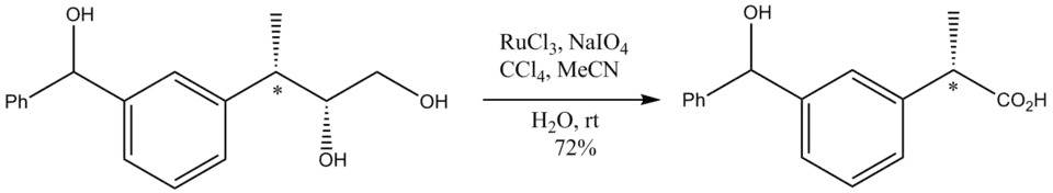 RuO4 est un oxydant particulièrement énergique : il faut veiller à ce que les conditions opératoires soient douces, généralement à température ambiante. Les centres stéréogènes qui ne sont pas oxydés sont cependant préservés, comme l'illustre l'oxydation ci-dessous d'un diol en acide carboxylique :