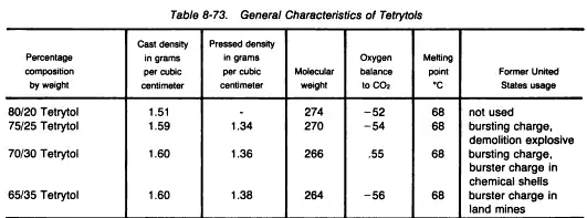 Typiquement, la proportion d'ingrédients (en poids) est de 65 %, 70 %, 75 % ou 80 % de tétryl à 35 %, 30 %, 25 % ou 20 % de TNT-tétryl eutectique, qui comprend elle-même 55 % de tétryl et 45 % de TNT[2]. Le tétrytol est plus sensible que le TNT et moins sensible que le tétryl à l'impact[2]. La vitesse de détonation des charges cylindriques non confinées (de 1 pouce, soit 2,54 cm de diamètre) du tétrytol est comprise entre 7 290 et 7 410 m/s avec une moyenne de 7 350 m/s pour le tétrytol 75/25 et de 7 340 m/s pour le tétrytol 65/35[2]. À des fins de comparaison, des charges cylindriques de TNT pure coulée de dimensions similaires exploseraient à une vitesse comprise entre 6 680 et 6 990 m/s[3].