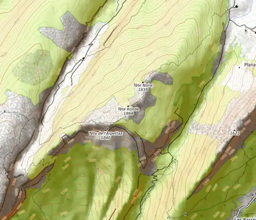 La tête de l'Arpettaz, la tête Ronde et la tête Noire (de gauche à droite) vues depuis le plateau de Beauregard au sud-est. | |||