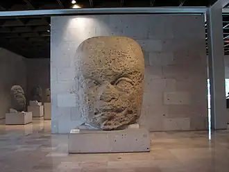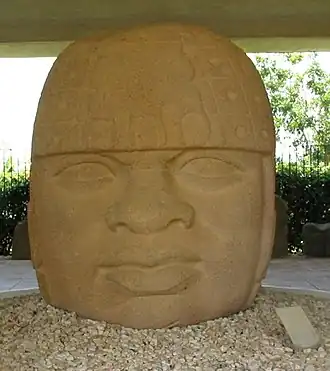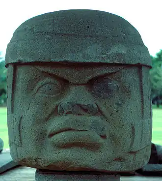 Les têtes colossales olmèques sont des sculptures monolithiques représentant des têtes humaines en ronde-bosse de grande taille. Taillées dans des rochers en basalte, elles datent au moins de 900 av. J.-C. et sont représentatives de la civilisation olmèque en Mésoamérique[1]. Des 17 têtes colossales connues, toutes représentent des hommes d'âge mûr avec des joues bien en chair, un nez plat et un léger strabisme. Chacune des statues comporte une coiffe distinctive. L'arrière des monuments est souvent plat. Les rochers proviennent des montagnes de la Sierra de los Tuxtlas de Veracruz ; comme les pierres utilisées pour la production des statues ont été transportées sur de grandes distances, nécessitant beaucoup de ressources et d'efforts humains, on pense que ces monuments sont les portraits de dirigeants olmèques puissants. Les têtes sont arrangées en lignes ou groupes sur des centres olmèques majeurs, mais la méthode et la logistique de leur transport sur ces sites restent peu claires.