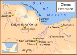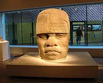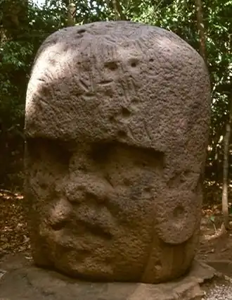 Les Olmèques sont les premiers habitants d'Amérique à avoir une architecture monumentale et à s'installer dans des villes. Ils sont également le premier peuple d'Amérique à développer un style de sculpture sur pierre sophistiqué[2]. Les premiers exemples de hiéroglyphes olmèques datent d'environ 650 av. J.-C. Des caractères olmèques ont été retrouvés sur des rouleaux et des objets en pierre ; les textes sont courts et ont été partiellement déchiffrés grâce à leur similarité avec d'autres écriture mésoaméricaines[5]. Des preuves d'une société complexe se développant dans la zone métropolitaine olmèque ont conduit à qualifier ceux-ci de « culture mère » de Mésoamérique[6], mais ce concept reste controversé[7].