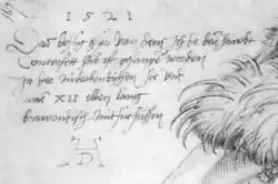 À gauche de la tête, Dürer a laissé une description de son dessin : Das dosig thyr van dem ich do das hawbt conterfett hab, ist gefange worden in der niderlendischen see und was XII ellen lang brawendisch mit für füssen (« L'animal que j'ai dessiné a été capturé dans la mer du nord aux Pays-Bas et était long de 12 coudées brabantines. »).