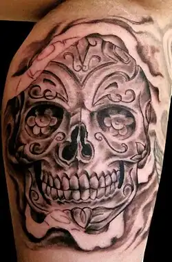 Sinon, ce tatouage peut aussi être utilisé comme signe de vie ou de rébellion lorsque celui est agrémenté de flammes ou autres motifs. Nous pouvons reprendre ici l’exemple de crâne mexicain : les calaveras. Image très en vogue, de nombreuses célébrités l'on inscrit sur leur peau comme Chris Brown, Rihanna ou encore Johnny Depp, des figures qui influencent les jeunes générations et lancent des effets de mode en démocratisant cette pratique et esthétique.