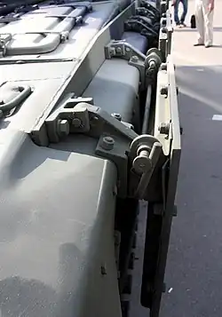 - T-90S Irak : les T-90S employés par l'armée irakienne reprennent les anciennes chenilles à axe secs RMSh, un climatiseur est monté sur le flanc gauche de la tourelle et un groupe auxiliaire de puissance est monté sur le déport de caisse, au-dessus du barbotin gauche. Le train de roulement est protégé sur les deux tiers de la longueur par des pré-blindages latéraux intégrant le blindage réactif explosif Relikt tandis que le dernier tiers est protégé par des grilles de protection statistiques.