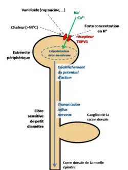 Lorsque le TRPV1 est soumis à un de ces stimuli, le récepteur est activé et change de conformation ce qui entraîne une ouverture du canal-cation. Les ions Ca++ et Na+ entrent massivement dans le cytoplasme de la fibre nerveuse ce qui crée une dépolarisation. Lorsque la dépolarisation atteint une valeur seuil, elle entraîne le déclenchement d'un potentiel d'action (PA).