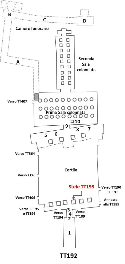 La tombe est située dans un angle de la première salle à colonnes de la tombe de Khârouef (TT192), laquelle date de la XVIIIe dynastie[1].