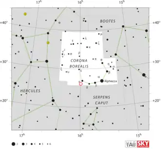 T Coronae Borealis (T CrB) est une étoile binaire symbiotique située à environ environ 806 pc (∼2 630 al) de la Terre dans la constellation de la Couronne boréale[9].