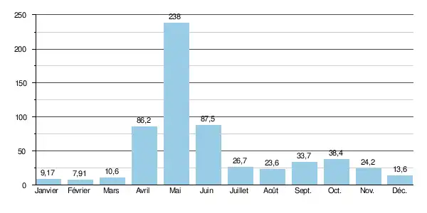 Le débit moyen mensuel observé en février (minimum d'étiage) est de 7,91 m3/s, soit plus ou moins de 3,5 % du débit moyen du mois de mai (238 m3/s), ce qui souligne l'amplitude très importante des variations saisonnières. Ces écarts de débit mensuel peuvent être plus marqués encore d'après les années : sur la durée d'observation de 52 ans, le débit mensuel minimal a été de 1,51 m3/s en , tandis que le débit mensuel maximal s'élevait à 350 m3/s en .