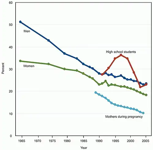 En 2006, 20,8 % de la population fume, soit une diminution de plus de moitié depuis 1965[23]. Parmi les jeunes, 21,7 % des lycéens et 8,4 % des collégiens fumaient en 2004[24]. En 2000 le tabagisme causait près de 440 000 décès annuels (soit environ un décès sur cinq)[25]. Le coût a été estimé, à la fin des années 1990, à près de 75 milliards de dollars (prise en charge médicale) et à 82 milliards de dollars (en perte de productivité)[26].