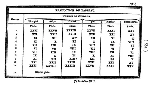 - ↑ Une autre longueur d'ombre est représentée par le vecteur A-10 = 14,5 pieds ; elle correspond à la longueur d'ombre de la dixième heure des mois de juin-juillet soit à la valeur 9 de la table.