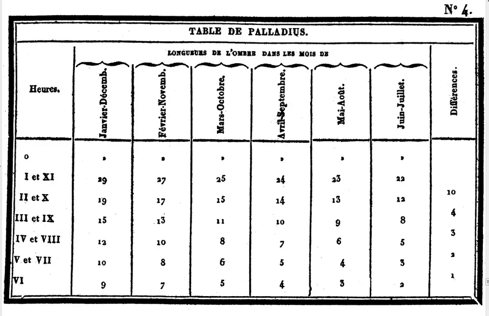 Dans son Traité d'agriculture (371 - 395), Palladius donne à la fin de chaque chapitre consacré à un mois de l'année une table d'ombre partielle[11]. La compilation sur l'année est donnée ici dans l'introduction ; les longueurs d'ombre sont en pieds.
