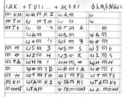 Le fac-simile partiel de l'inscription grecque de gauche laisse apparaitre dans sa partie haute les noms de plusieurs mois du calendrier alexandrin en usage en Égypte au (Ve siècle), ΦΑMENωC, MEXI , TVII, XOIAK, soit Phamenoth, Méchir, Tybi, Chæack ; dessous, des colonnes de chiffres. Transcrites, ces inscriptions ont permis de reconstituer la table d'ombre pour six mois telle que proposée par l'auteur de l'article. Les manques ont été reconstitués à partir des progressions constatées entre les valeurs décryptées du fac-simile.