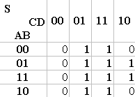 Pour trouver une somme, il faut regrouper les valeurs de S égales à 1. Le nombre de 1 dans chaque groupe doit être égal à une puissance de 2. Les groupes formés doivent être les moins nombreux possibles, mais ils doivent englober tous les 1. Un 1 peut être inclus dans plus d'un groupe, par contre aucun 0 ne doit être inclus. Les groupes sont composés d'une ou plusieurs colonnes et d'une ou plusieurs lignes. Si possible, assemblez-les par valeurs d'entrées communes. Par exemple, la colonne 2 et la colonne 3 ont pour valeur commune D=1. La ligne 1 et la ligne 4 ont la valeur B=0 en commun..