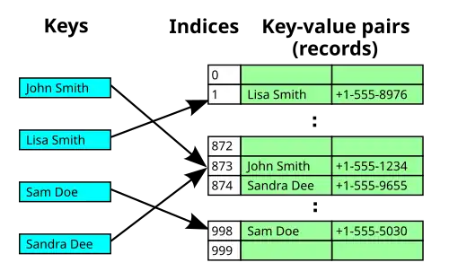 Il s'agit d'un tableau ne comportant pas d'ordre (contrairement à un tableau ordinaire qui est indexé par des entiers). On accède à chaque valeur du tableau par sa clé, qui, transformée par une fonction de hachage en une valeur de hachage (un nombre), indexe les éléments de la table, ces derniers étant appelés alvéoles (en anglais, buckets ou slots).