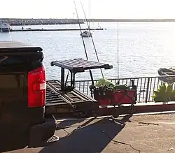 Certaines tables de pique-nique du marché secondaire peuvent être fixées au hayon d'une camionnette, pour le camping, la pêche, la chasse, le sport, le barbecue, la fête du hayon ou comme bureau d'ordinateur extérieur.