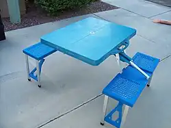 - ↑ (en) C.H. Nielsen, « US769354A - Table » [archive du ], Google Patents, (consulté le ) : « My invention is an improvement in tables, the main object being to provide a table ... which can be folded up into a collapsed table for transportation purposes ... my table is particularly designed and adapted for use at picnics and other gatherings of a similar character where temporary use only is required. »
