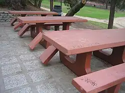 L'apposition de graffitis sur les tables de pique-nique, soit par gravure soit par marquage, est une forme courante de vandalisme dans les aires de loisirs . Des études aux États-Unis[28] et à Taïwan[29] ont montré que le vandalisme sur une table de pique-nique est plus susceptible de se produire lorsque la table de pique-nique a déjà été vandalisée. Ce phénomène a été expliqué, en utilisant le cadre de la psychologie écologique, comme le vandalisme préexistant agissant comme un signal déclencheur pour de nouveaux vandales[28]. Par conséquent, les exploitants d'installations de pique-nique peuvent mieux prévenir le vandalisme en s'assurant que tout vandalisme qui s’y produit soit traité rapidement[28]. Alors que les graffitis sont le type de vandalisme le plus courant, les tables de pique-nique en bois sont aussi parfois brisées par les campeurs pour être utilisées comme bois de chauffage[19].