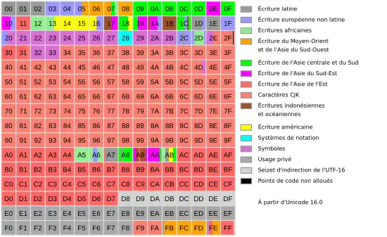 Les blocs affichés sur fond noir sont pour des points de codes réservés de façon permanente à des « non-caractères ».