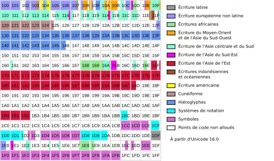 Les blocs affichés sur fond noir sont pour des points de codes réservés de façon permanente à des « non-caractères ».