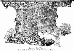 La table peut être en bois[1] ou en pierre[2], et comporte des éléments ouvragés inspirés directement de l'architecture : frise, colonne, chapiteau, rinceau, pilastre, volute, traverse en arcature… C'est un vrai objet d'apparat sculpté, dessiné, et réalisé par les meilleurs artistes.