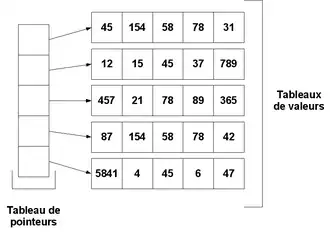 Un tableau à deux dimensions (aussi appelé matrice) est en fait un tableau normal (à une dimension) dont les éléments sont eux-mêmes des tableaux contenant les éléments du tableau à deux dimensions. On voit ceci sur l'illustration ci-contre, où chaque élément du premier tableau (vertical à gauche) est un tableau (horizontal).