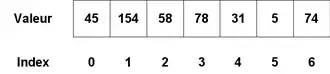 Avec un tableau à une dimension (aussi appelé un vecteur), un numéro d'index donne accès à un seul élément. L'image de droite géométrique est une représentation graphique d'une telle structure de données, composée de 7 éléments.