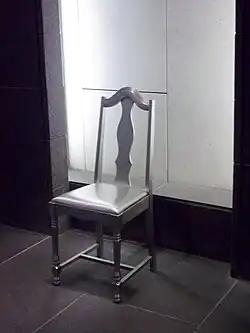 Le dernier volet de la composition de monsieur Goulet est une chaise en acier inoxydable au fini brillant. Il peut être perçu comme le point de départ ou la conclusion de la composition : tout dépend si on y accède en premier ou à la fin par rapport au cheminement dialectique. Cette chaise offre un choix entre plusieurs interprétations. L’individu qui se trouve face à elle peut :