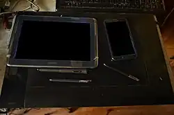 Le premier constructeur à avoir proposé cela est Samsung en associant à ses séries de téléphones Galaxy Note et de tablettes avec la Galaxy Note 10.1, utilisant les technologies de stylet de Wacom. Elles permettent d'utiliser ce type de tablette comme une tablette graphique à écran intégré. Différents logiciels ont été créés (Adobe, Samsung Notes, Markers), ou adaptés (comme Krita), à des systèmes d'exploitation mobile, afin de les utiliser à cet effet.