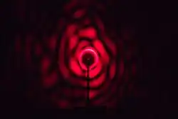 En 2009, une tache de Fresnel a pu être produite avec un jet supersonique de molécules de deutérium (qui sont des ondes de matière[21] électriquement neutres). On sait par la mécanique quantique que les particules matérielles peuvent se comporter comme des ondes. La nature ondulatoire des particules remonte aux théories de hypothèse de de Broglie[22] et à l'expérience de Davisson et Germer[23]. On peut observer des taches de diffraction d'électrons, qui sont un type d'ondes de matière, en microscopie à transmission électronique lorsque l'on examine des structures circulaires d'une certaine taille.