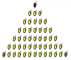 | Coin / Pointe / Éperon (cuneus) | depuis l'Antiquité | Plutôt élevée | Élevée | Applicable à l'infanterie comme à la cavalerie, ces formations sont utiles lors de charges et favorisent les percées. | |