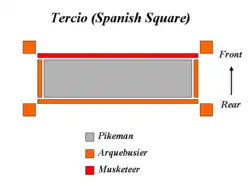 Tercio / Pique et tir (en) / Lansquenets / Terço (en) | XVe – XVIIIe siècle | Limitée | Élevée | Combine piquiers et fantassins à armes à feu |