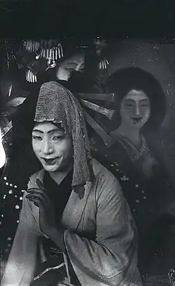 Tadaoto Kainoshō apprécie également se mettre en scène. Il pose habillé et maquillé à la manière des onnagata et utilise la photographie comme outil à la réalisation de ses tableaux, tel que Avant de monter sur scène pour jouer Katsuragawa (1915)[2]. S’il n’était pas rare pour les peintres de nihonga de Kyōto d'apprécier le théâtre, Kainoshō l'intègre pleinement dans sa pratique[1] en combinaison avec la photographie qui occupent également une place importante de son processus créatif.