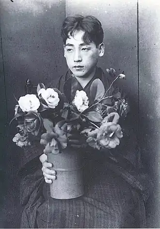 Ou bien, dans Épilation (1915)[9], on retrouve la figure d’un éphèbe (wakashū) qui est reconnaissable par sa coiffure et sa mèche avant qui recouvre un haut du crâne rasé. Pour la réalisation de cette œuvre, Kainoshō s’est servi d’un ami comme modèle pour ses croquis et a ensuite transposé son propre visage sur l'œuvre finale. C’est une pratique qui est constatée dans d’autres peintures, notamment sur des figures féminines[1].