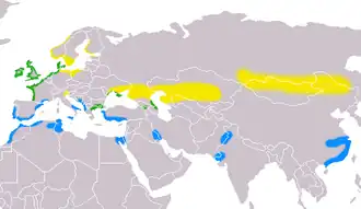 Il s'agit d'une espèce paléarctique dont la distribution est scindée en deux aires principales, l'une sur les rivages maritimes du nord-ouest de l'Europe et l'autre dans les régions semi-arides d'Asie centrale.