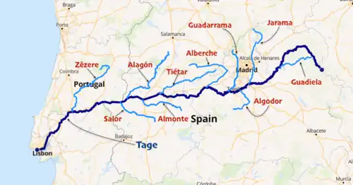 Le Tage (en espagnol : Tajo, en portugais : Tejo) est un fleuve qui prend sa source en Espagne, traverse le Portugal où il se jette dans l'océan Atlantique à Lisbonne.