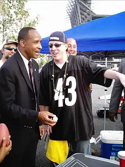 - ↑ Kara Ritter, « Ex-Steeler looks to sway support of Eagles' fans (abstract) », Philadelphia Inquirer, (lire en ligne, consulté le )