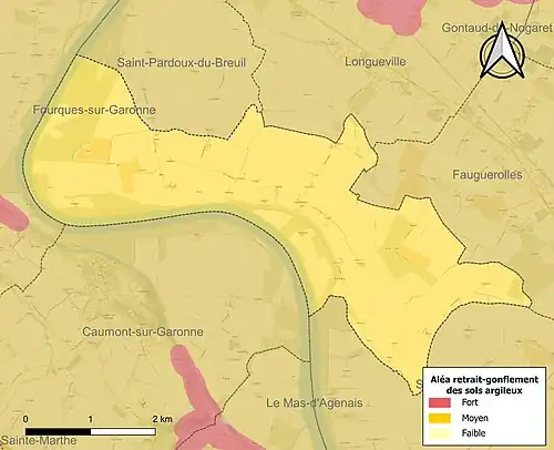 Le retrait-gonflement des sols argileux est susceptible d'engendrer des dommages importants aux bâtiments en cas d’alternance de périodes de sécheresse et de pluie[20]. La totalité de la commune est en aléa moyen ou fort (91,8 % au niveau départemental et 48,5 % au niveau national)[Carte 2]. Depuis le , en application de la loi ELAN, différentes contraintes s'imposent aux vendeurs, maîtres d'ouvrages ou constructeurs de biens situés dans une zone classée en aléa moyen ou fort[Note 3],[21].