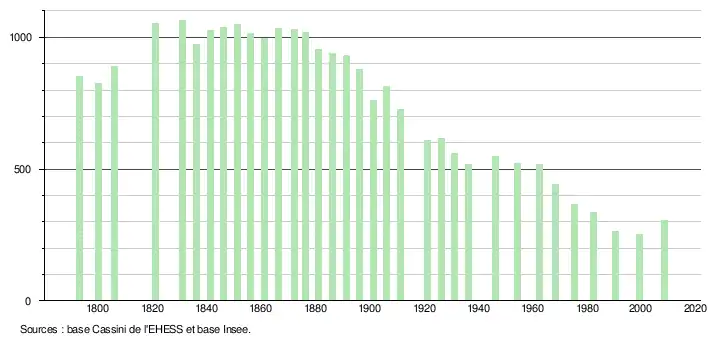 - ↑ Par convention dans Wikipédia, le principe a été retenu de n’afficher dans le tableau des recensements et le graphique, pour les populations légales postérieures à 1999, que les populations correspondant à une enquête exhaustive de recensement pour les communes de moins de 10 000 habitants, et que les populations des années 2006, 2011, 2016, etc. pour les communes de plus de 10 000 habitants, ainsi que la dernière population légale publiée par l’Insee pour l'ensemble des communes.