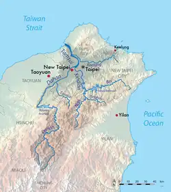 Taipei est située dans la partie occidentale de Taïwan, presque à l'extrémité nord de l'île, sur le fleuve Danshui, à environ 25 kilomètres au sud-ouest de Keelung, qui est son port sur l'océan Pacifique et 20 kilomètres au sud-est de la ville côtière de Danshui, située à l'embouchure du fleuve homonyme sur le détroit de Taïwan. La ville s'étend dans la vallée en cuvette relativement étroite du fleuve Danshui et de ses deux principaux affluents, les rivières Keelung et Xindian. La zone centrale, côté ouest présente une faible altitude, celle-ci s'élève au sud, à l'est et au nord où elle atteint 1 120 mètres au mont Qixing (七星山).
