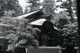Le gong à l'extérieur du daikyakuden qui sert tous les soirs à rassembler les participants à la cérémonie du ushi-tora gongyō (it).
