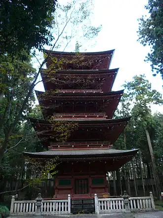 Achevée en 1749, la pagode du Taiseki-ji fait face à l'ouest plutôt qu'au sud comme il est accoutumé pour signifier que le bouddhisme de Nichiren se propage de l'est (le Japon) à l'ouest (retour à la terre de Sakyamuni Bouddha et au-delà). Elle est la plus grande pagode à quatre étages le long du Tōkaidō, route principale historique le long de la côte est du Japon à partir d'Edo (aujourd'hui Tokyo) vers Kyoto. L'édifice, désigné trésor national en 1966, est ouvert tous les pour des cérémonies célébrant l'anniversaire de Nichiren.